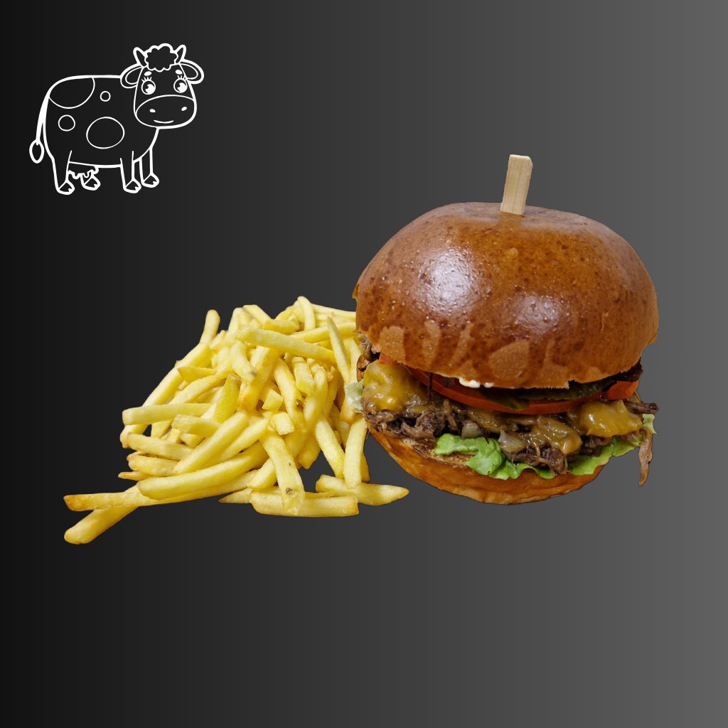 100g hovězí maso trhané, slanina, ledový salát, rajče, nakládaná okurka, sýr typu chedar, červená cibule, Funny dresing, bulka, 130g hranolek